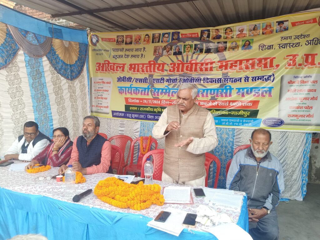 कार्यक्रम की अध्यक्षा यशपाल सिंह लोधी ,प्रदेश अध्यक्ष,रामबचन राजभर ,उत्तराखंड के प्रदेश अध्यक्ष ,अनिल कुमार भारती ,विभा पाल,अशोक कुमार मौर्य प्रदेश सचिव , रामकेश पटेल , राजकुमार मौर्य,मंच का संचालन राम ध्यान कुशवाहा ने कियाओबीसी कार्यकर्ता सम्मेलन संपन्न,प्रदेश के पदाधिकारी रहे मौजूद ,ओबीसी के अधिकारों का हो रहा हनन, प्रदेश अध्यक्ष,यस पाल सिंह लोधी गाजीपुर ,कासिमाबाद ,अखिल भारतीय ओबीसी महा सभा कासिमाबाद गाज़ीपुर राजकीय कृषि भवन के पास विशुनपुर में कार्यकर्ता सम्मेलन का आयोजन किया गया , कार्यक्रम के मुख्य अतिथि विजय सिंह पाल ने नव निर्वाचित जिलाध्यक्ष राजू कुशवाहा को माला पहनाकर स्वागत किया ,मुख्य अतिथि ने कहा कि ओबीसी का अधिकार छीना जा रहा है,हमारी जनसंख्या के आधार पर हमें हमारा अधिकार हमे नहीं मिला , तथागत बुद्ध के बताए गए अष्टांगिक मार्ग से ही विश्व में शांति स्थापित होगी । गौतम बुद्ध, जिन्हें सिद्धार्थ गौतम, शाक्यमुनि या केवल बुद्ध के नाम से भी जाना जाता है, जिनकी शिक्षाओं ने बौद्ध धर्म के विकास का आधार बनाया। बुद्ध एक संस्कृत शब्द है जिसका अर्थ है जागृत या प्रबुद्ध।बुद्ध ने दुनिया को नैतिकता, ध्यान और ज्ञान का अभ्यास करके आत्मज्ञान का मार्ग सिखाया। उनके कुछ उद्धरणों को पढ़कर उनके और उनकी मान्यताओं के बारे में अधिक जानें, जो आपको जीवन के सभी पहलुओं में प्रेरित, उत्थान और प्रोत्साहित कर सकते हैं। सावित्री बाई फूले ने समाज की महिलाओं को पढ़ने के लिए पहला विद्यालय खुलवाया उन्हें भी तमाम यातनाएं झेलनी पड़ी , यहां तक कि उनके ऊपर कीचड़ भी उछाला गया ,तब जाकर महिलाओं को उनका अधिकार मिला ।हम सब के पूजनीय हमारे महा पुरुष है ।जिन्होंने हम सबके लिए अधिकार की लड़ाई लड़ी ।कार्यक्रम की अध्यक्षा यशपाल सिंह लोधी ,प्रदेश अध्यक्ष,रामबचन राजभर ,उत्तराखंड के प्रदेश अध्यक्ष ,अनिल कुमार भारती ,विभा पाल,अशोक कुमार मौर्य प्रदेश सचिव , रामकेश पटेल , राजकुमार मौर्य,मंच का संचालन राम ध्यान कुशवाहा ने किया