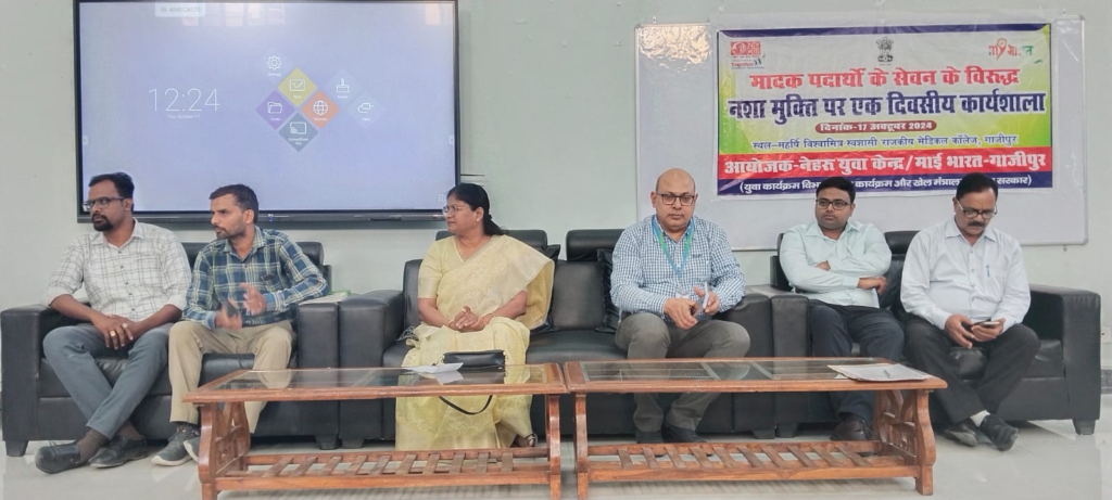 गाजीपुर – नेहरू युवा केंद्र गाज़ीपुर, माय भारत के अंतर्गत मादक पदार्थों के सेवन के विरुद्ध नशा मुक्ति पर एक दिवसीय कार्यक्रम का शुभारंभ महर्षि विश्वामित्र स्वशासी राजकीय मेडिकल कॉलेज गाजीपुर के प्रांगण में श्रीमती सरिता अग्रवाल अध्यक्ष नगर पालिका परिषद गाजीपुर एवं अन्य मंचासीन अतिथियों ने दीप प्रज्वलित कर किया । मुख्य अतिथि सरिता अग्रवाल ने कहा कि नशा आज देश की ज्वलंत   समस्या है सयह युवा पीढ़ी को लगातार अपने आगोश में ले रही है सबच्चे अपने माता-पिता से सीखते हैं ।माता-पिता को भी अपनी जिम्मेदारियां को समझना होगा। उन्हें स्वयं आगे आकर इस बुराई को दूर करने में सहायक सिद्ध होना होगा । माय भारत के युवाओं द्वारा जिला अस्पताल में चले शैक्षिक प्रशिक्षण कार्यक्रम का समापन भी किया ।उन्होंने कहा कि स्वस्थ होना अपने आप में अमूल्य धन है। स्वच्छता भी बहुत आवश्यक है ।