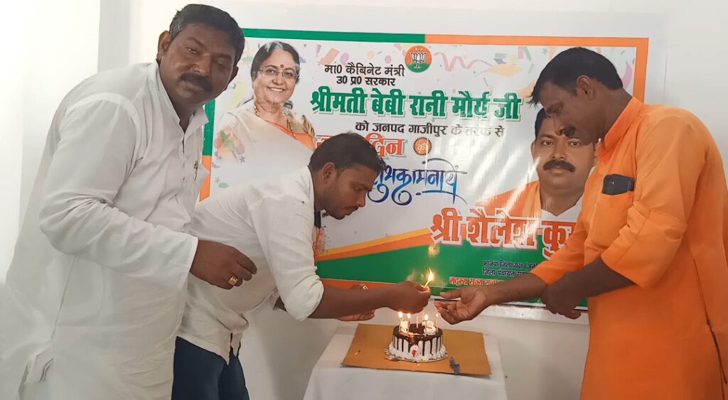 गाजीपुर बरही में शैलेश कुमार राम के आवास पर कैबिनेट मंत्री बेबी रानी मौर्य के जन्मदिन पर शैलेश कुमार राम की तरफ से एक पार्टी रखी गई वह बेबी रानी मौर्य के जन्मदिन के शुभ अवसर पर शैलेश कुमार राम और राकेश यादव ने मिलकर केक काटा बेबी रानी मौर्य के चित्र पर के खिलाते हुए भारत माता की जय के नारे भी लगे शैलेश कुमार राम ने बताया कि बेबी रानी मौर्य हम लोगों की आदर्श है राजनीति की प्रेरणा हमें उनसे ही मिलती है