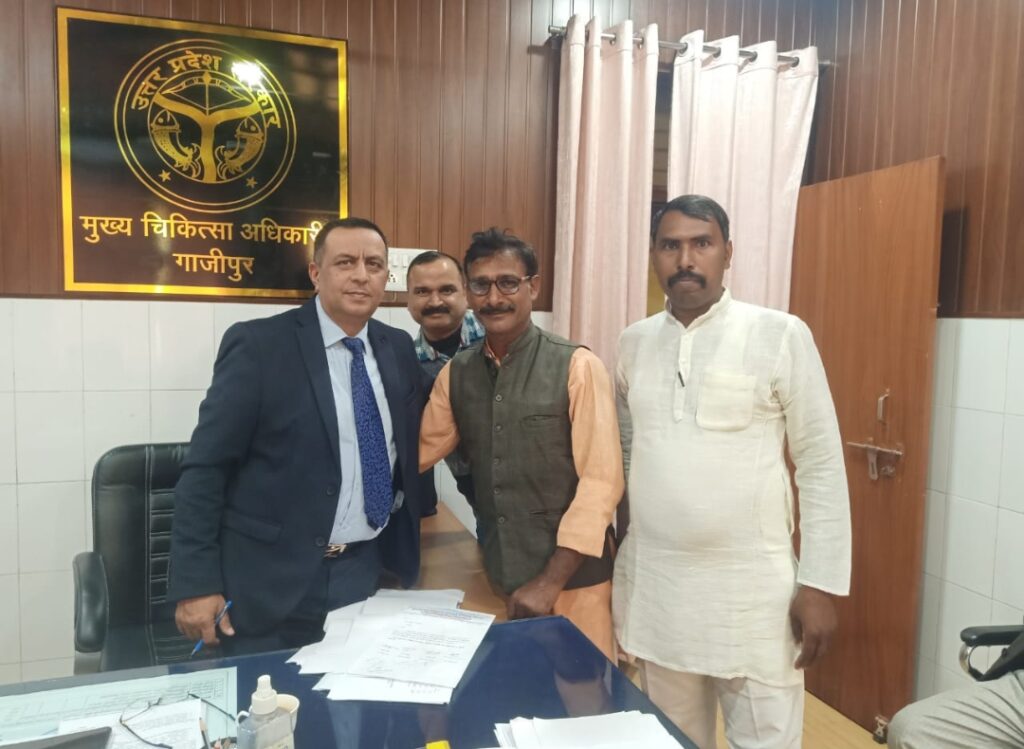 गाजीपुर, गोविंदपुर किरात में अगले महीने 7 जनवरी को होने वाले मुक्त नेत्र चिकित्सा शिविर को लेकर समाजसेवी राजकुमार मौर्य अध्यक्ष राकेश यादव सेना के जवान अनिल सिंह मुख्य चिकित्सा अधिकारी अनिल पांडे को पत्रक सौंपा