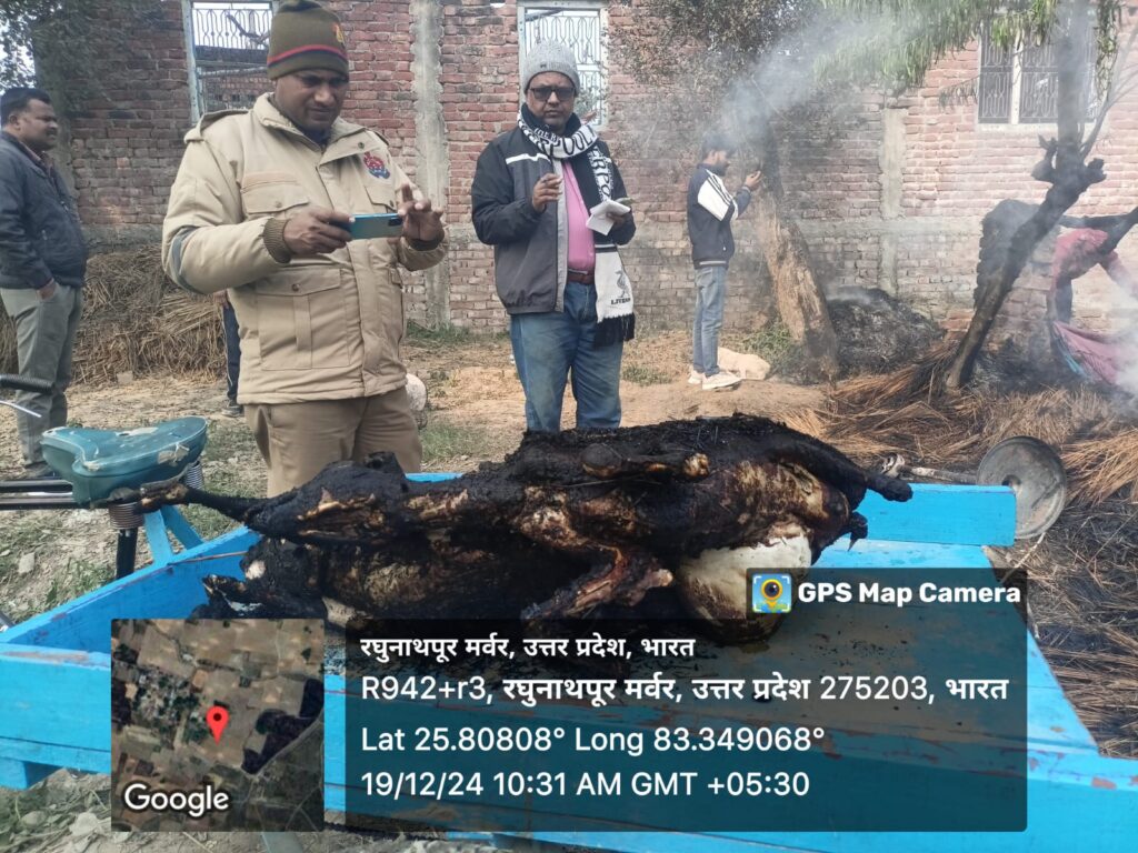 ठंड में लोग अपने घरों में सोए थे चिख पुकार सुनकर जब तक लोग पानी फेंक कर आग पर काबू पाना चाहा तब तक झोपड़ी में सो रही प्रमोद पासी की 10 वर्षीय मासूम वर्षा और 10 बकरियां आग में शोला बन गई।
