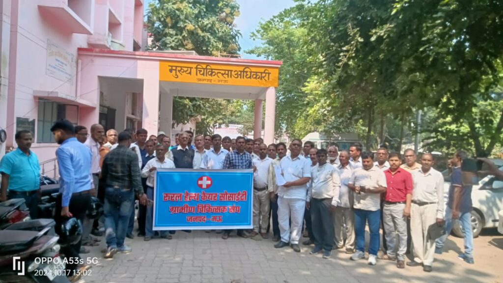मऊ :- आज दिनांक 17/10/2024 को ग्रामीण चिकित्सको की रूरल हेल्थ केयर सोसाइटी के बैनर तले हिन्दी भवन एक बैठक हुई जिसकी अध्यक्षता प्रदेश अध्यक्ष डाक्टर रमाकांत यादव जी ने किया बैठक के उपरांत ग्रामीण चिकित्सको की समस्याओ को लेकर एक ज्ञापन माननीय मुख्य मंत्री उत्तर प्रदेश सरकार को जिलाचिकित्साधिकारी व माननीय जिलाधिकारी के द्वारा दिया गया। जिसमे ग्रामीण क्षेत्रों के डॉक्टर सैकड़ों की संख्या में मौजूद रहे।